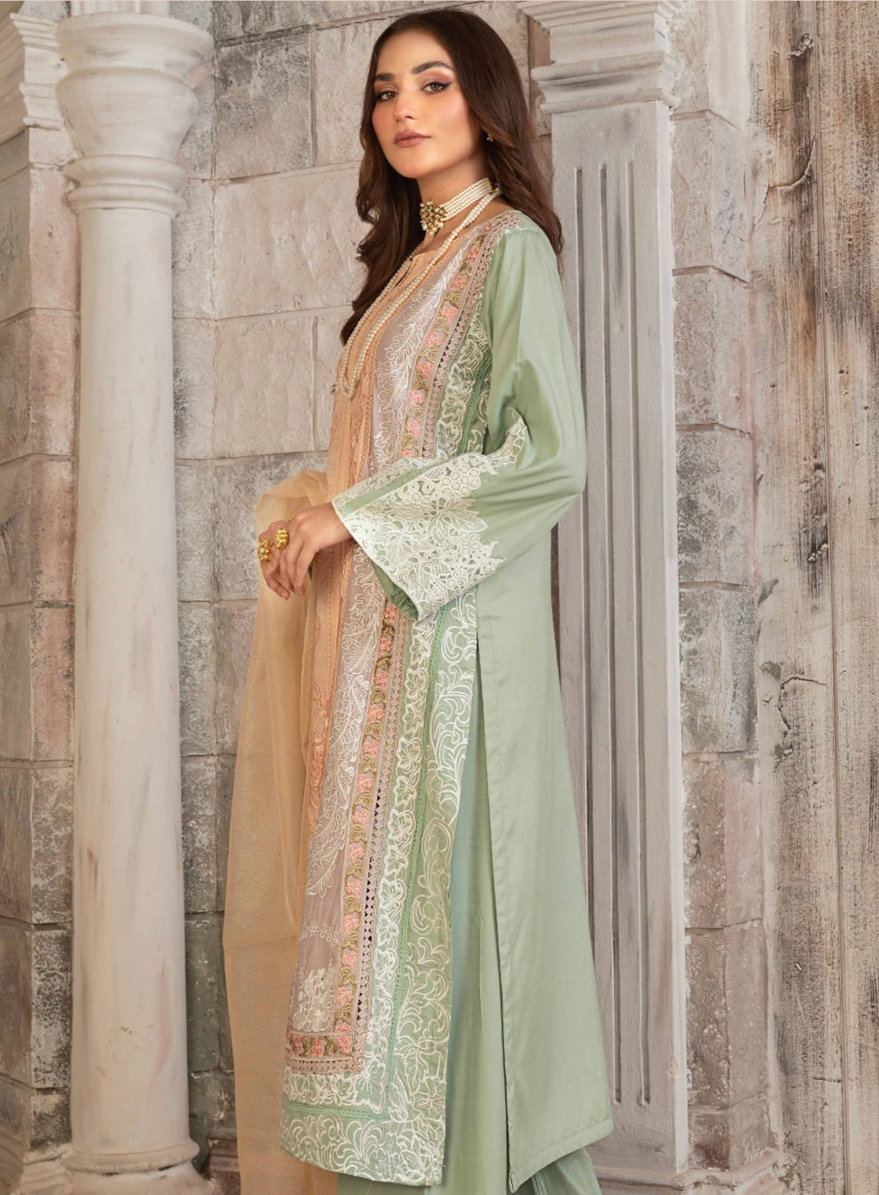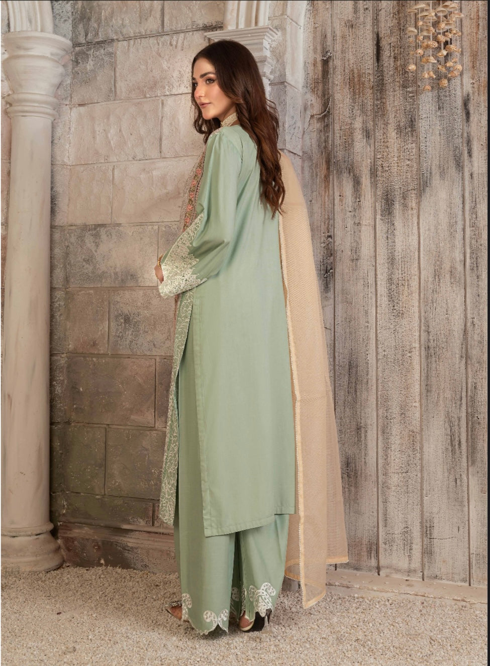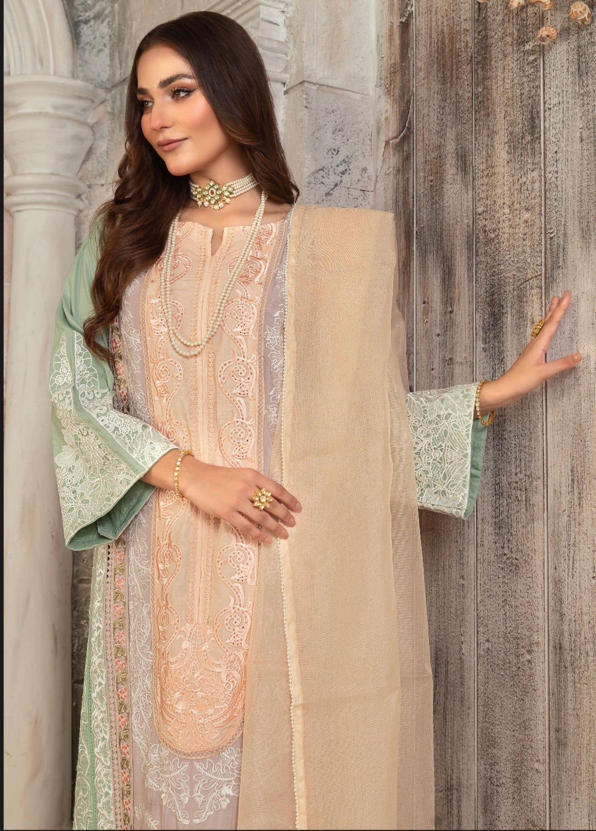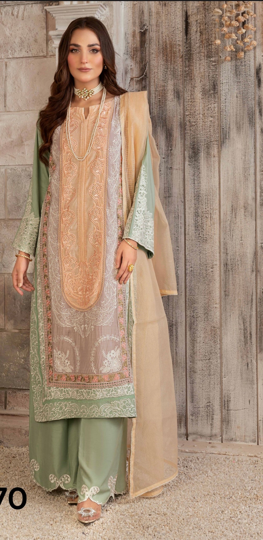 designer inspired embroidered linen outfit a long length embroidered kameez with lace details comes with wide leg matching linen trouser and contrasted dupatta with pearl trim on all ends.