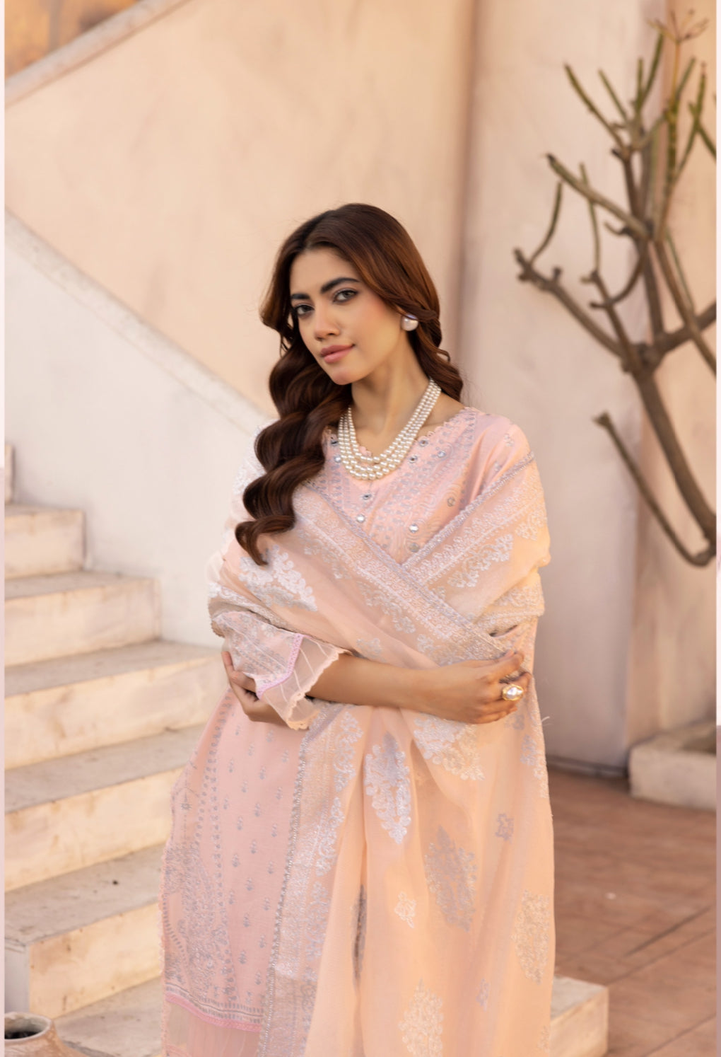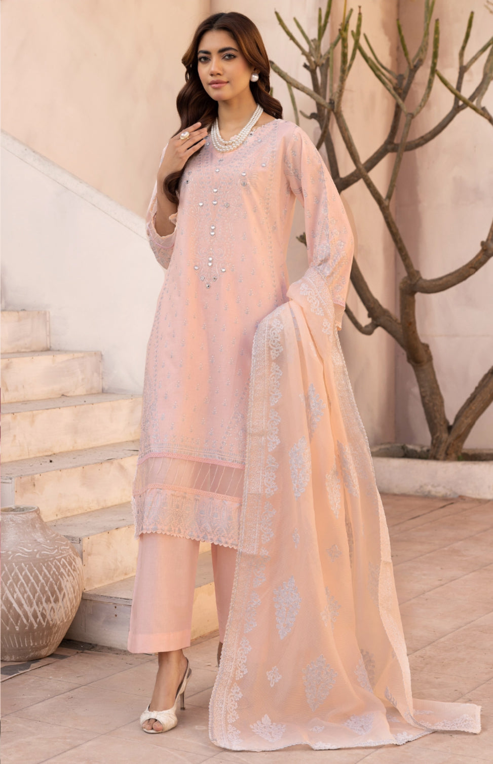 This Designer inspired outfit features Printed Lawn shirt with mirror detailing. Paired with matching cotton straight cut trouser and stunning luxury embroidered dupatta.