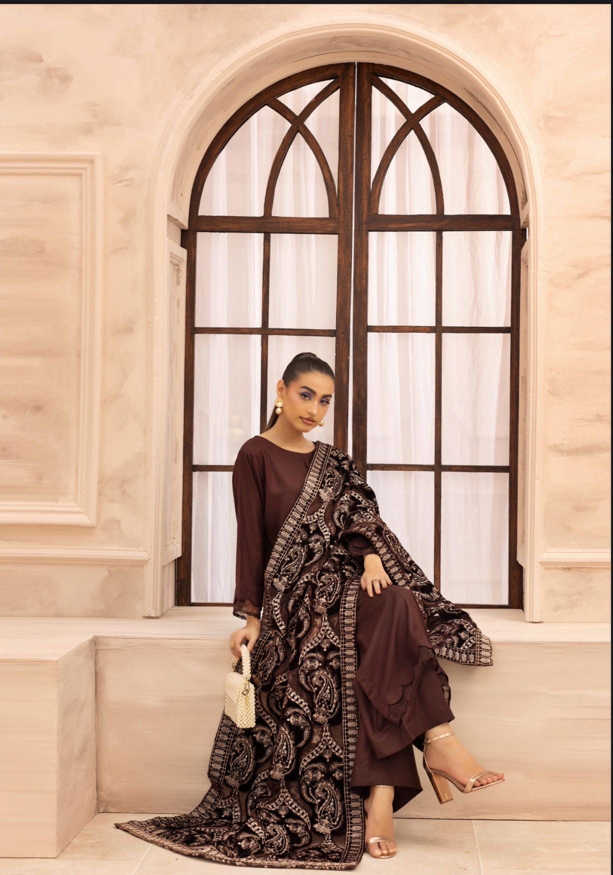 This beautiful outfit features straight plain dhannak kameez with button details and stitching details on neckline along with full sleeves with stiching details on cuffs. It comes wideleg trouser and stunning velvet laser cut shawl.