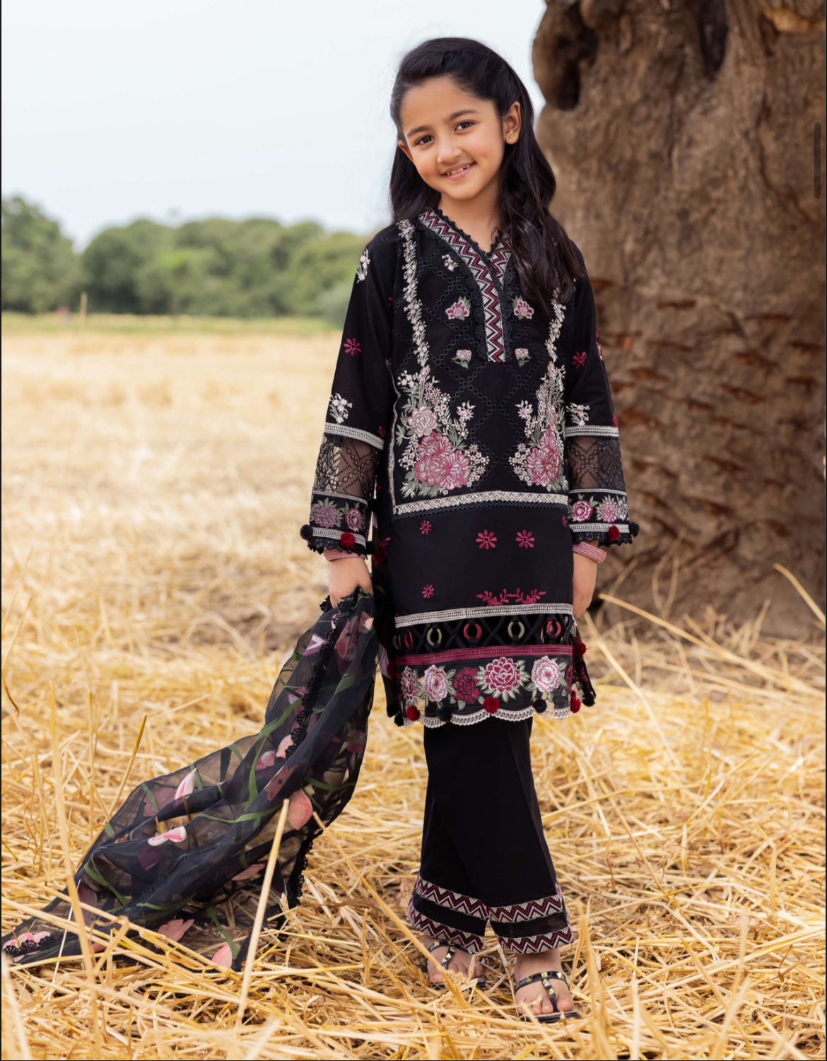 This beautiful 3 piece Heer kids collection features a straight shirt with luxury thread work embroidery throughout with cut design piping embellishment on the border and full length embroidered sleeves. Paired with wide leg embroidered trousers. The look is finished with an embroidered organza dupatta. Perfect casual festive wear for this Eid.
