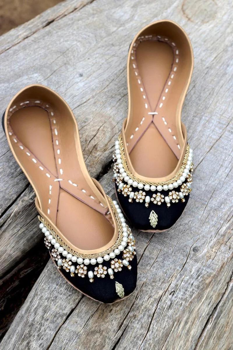 womens black khussa with pearl and dabka work.
