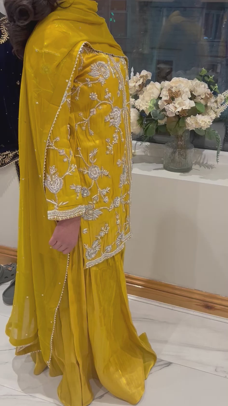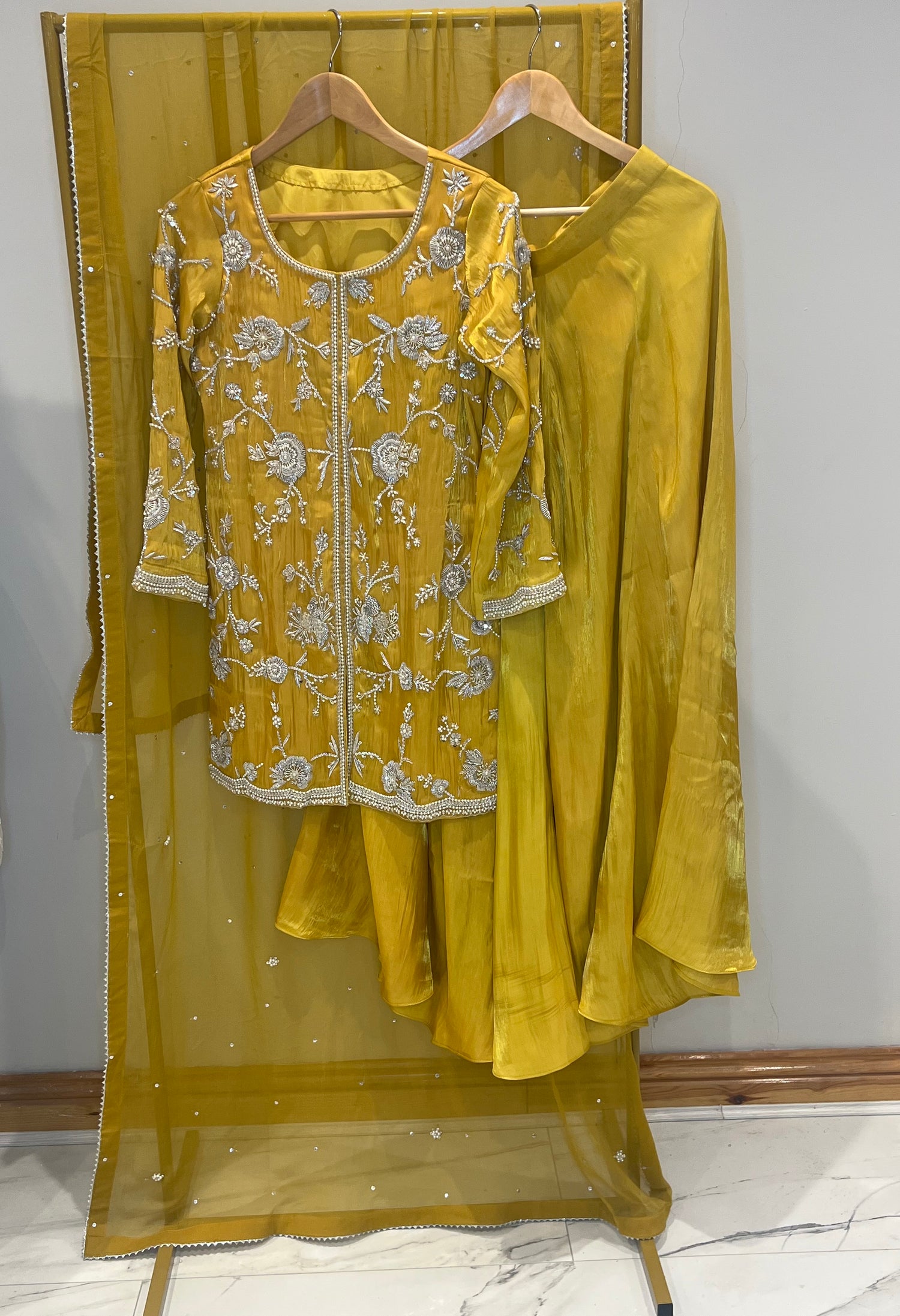 Elevate your occasion wear with this exquisite mustard ensemble, crafted for timeless elegance. The outfit features intricate silver embroidery delicately hand-worked across a rich, silk fabric, creating a perfect balance of tradition and luxury. Floral motifs and fine detailing enhance the silhouette, while the embellished neckline and borders add a refined, graceful finish.