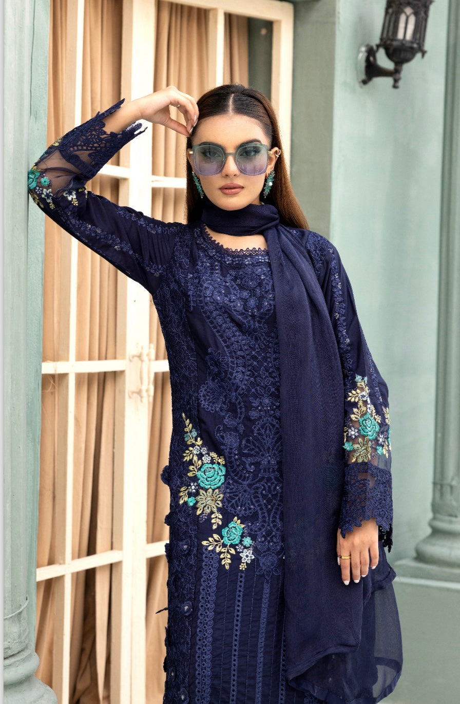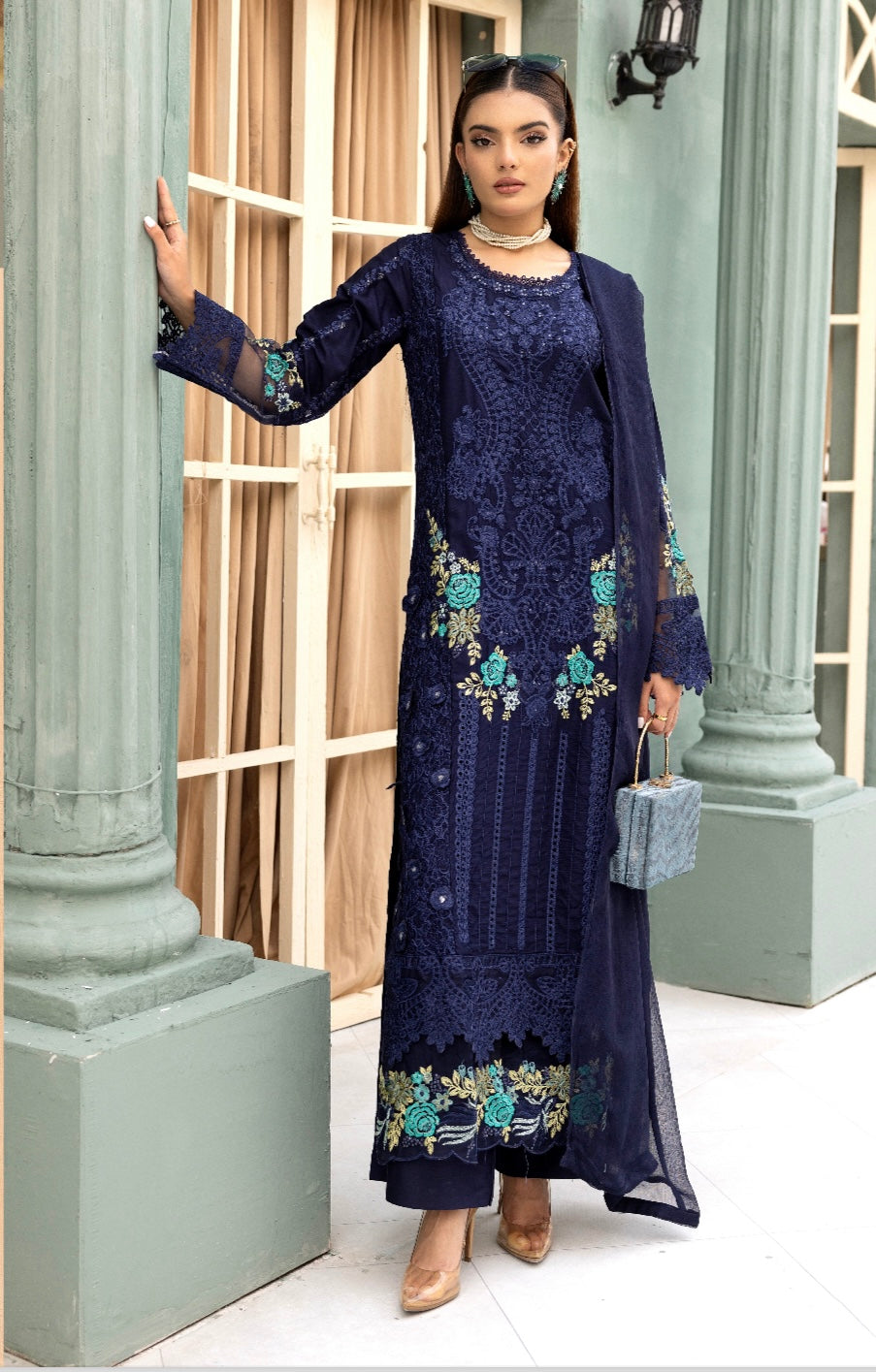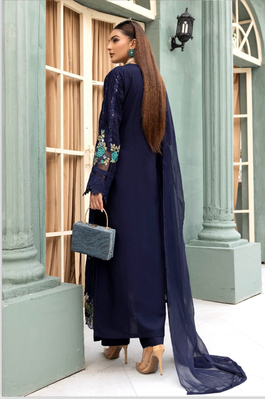 This Stunning Linen outfit features fully chikankari embroidered kameez front with embellishment alone with full legnth embroidered sleeves. It is paired with plain linen trousers and plain chiffon duppatta.