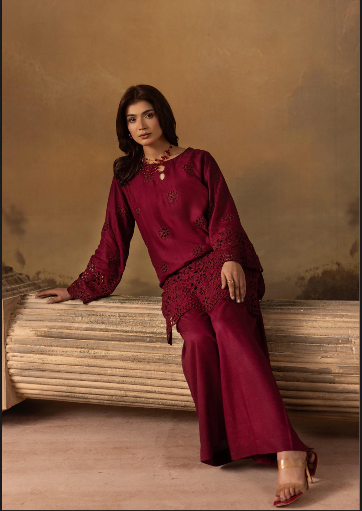 This Luxkari Coords 02-Maroon set includes a beautifully embroidered chikankari kameez made with high-quality linen, accompanied by a comfortable and stylish pair of wide leg trousers. Perfect for any occasion, this set offers a classic yet modern look that is sure to impress.