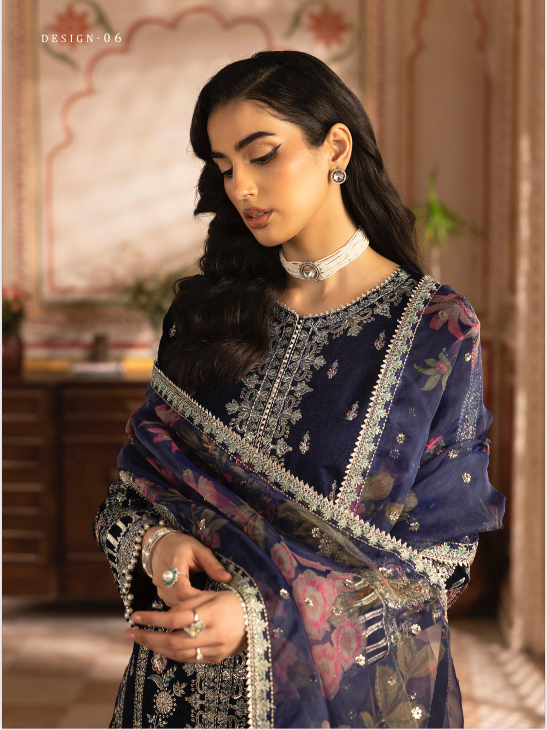 Introducing Luxury Velvet 05 - the ultimate outfit for those who crave sophistication and elegance. The 3-piece velvet outfit includes a heavy embroidered kameez, paired with a silk trouser and a stunning self-printed and embroidered organza dupatta. Experience luxury and style all in one with this must-have ensemble.
