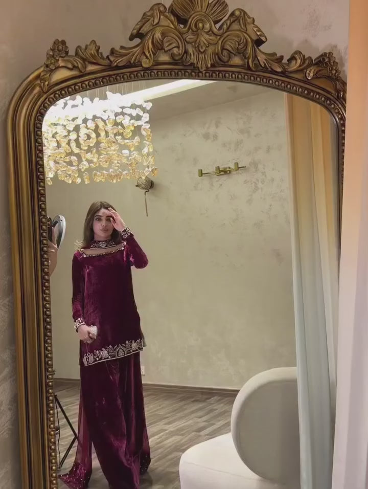 Deep plum velvet outfit featuring a sleek straight shirt with statement neckline cut, detailed handwork on sleeves & hem, paired with wide-leg velvet trousers. Finished with an embellished chiffon dupatta for the perfect winter-festive look—rich, elegant, and effortlessly classy.